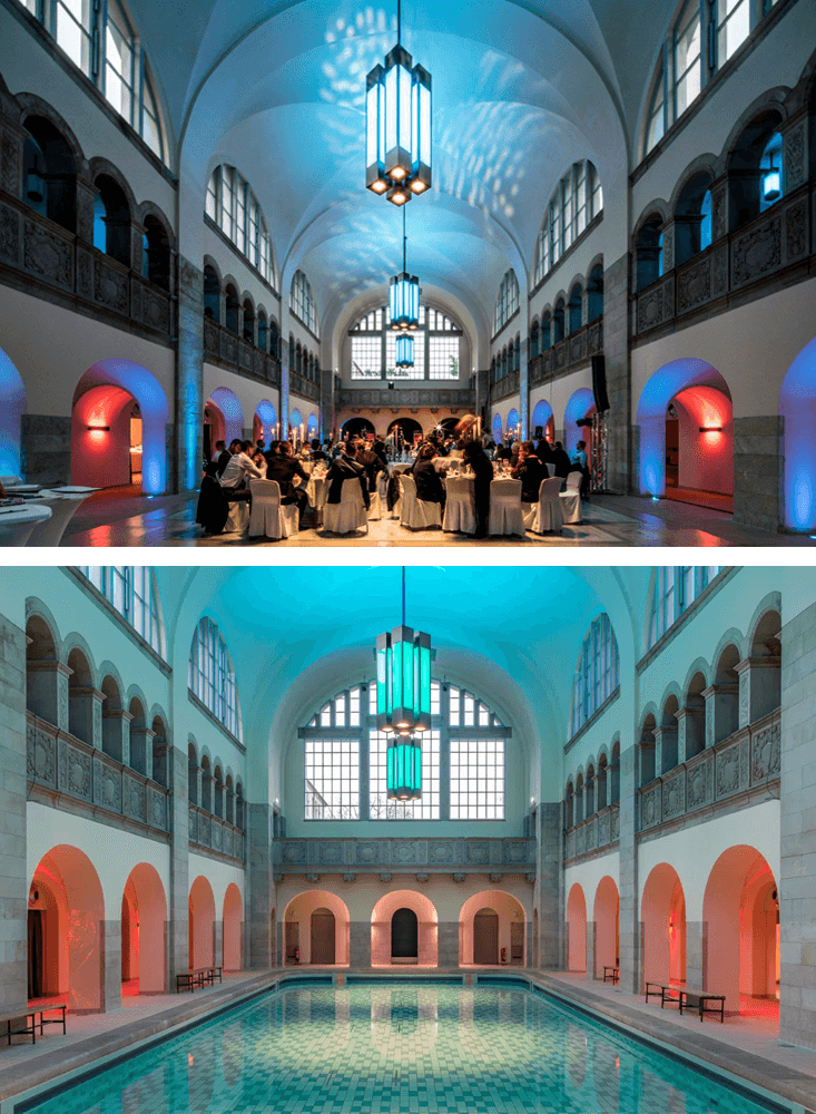In het hart van Berlijn ligt het monumentale Stadtbad Oderberger, ooit een openbaar badhuis, nu een adembenemende eventlocatie. Dankzij de beweegbare zwembadvloer van Inducon verandert het voormalige zwembad in enkele minuten van waterbassin naar een elegante zaal voor diners, concerten of conferenties.